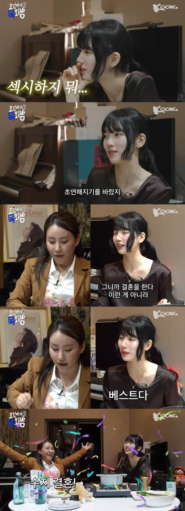이어 조현아가 결혼식 규모에 대해 묻자 수지는 "만약 결혼식을 한다면 아예 소박하거나 성대하거나 둘 중 하나일 것"이라고 답했다.