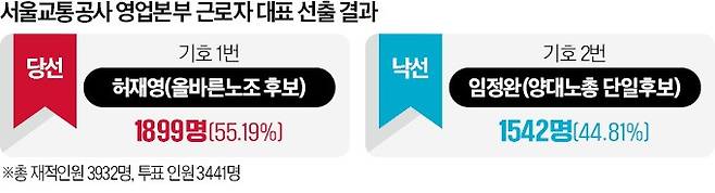 10일 서울교통공사에 따르면 영업본부 내 산업안전위원회 근로자대표를 비노총 출신이 맡는 것은 이번이 처음이다. 그동안 조합원의 과반을 차지한 민주노총 출신이 당연직처럼 맡아왔던 자리다. 과반을 넘으면 투표를 하지 않고 당연직으로 근로자대표를 맡을 수 있다.