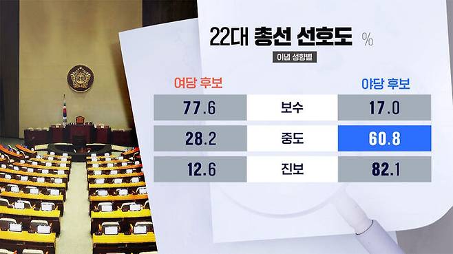 이념 성향별로 봤을 때 중도층에서 야당을 뽑겠다는 의견이 두 배 이상 많았습니다.