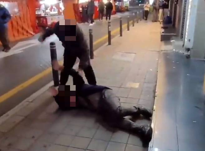 먼저 주먹을 휘둘렀던 남성은 상대가 내지른 주먹을 얼굴에 맞고 그 자리에서 넘어진다. 서 있던 남성은 쓰러진 남성에게 다가가 얼굴을 밟고 주먹질한다. 4~5번 정도의 주먹질이 이어진 뒤에야 옆에서 싸움을 지켜보던 남성들이 이들을 제지한다.
