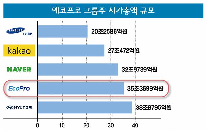 에코프로비엠(21조9500억원)은 코스닥 시가총액 1위, 에코프로(12조2900억원)는 2위 기업이다. 에코프로에이치엔도 코스닥 시총 48위 기업으로 시가총액이 1조원을 웃돈다. 이들 기업의 시가총액을 모두 합치면 35조3000억원이 넘는다. 코스피 시가총액 9위인 네이버를 가볍게 제치고 8위인 현대차를 바짝 뒤쫓는 모양새다.