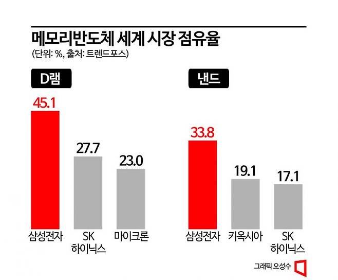 특히 삼성전자, SK하이닉스, 마이크론 3개사의 과점 체제로 돌아가고 있는 D램의 경우 삼성전자 점유율이 시장 독점 판단의 기준이 되는 50%에 육박해 있다. 사실상 시장 지배적 사업자인 셈이다. 낸드 시장은 현재 상위 1~3위 기업이 시장의 70%를 나눠갖고 있지만 지금의 업황 악화가 심화하면 웨스턴디지털 같은 하위 사업자들이 타격을 받아 언제든지 과점시장으로 바뀔 가능성이 열려 있다.