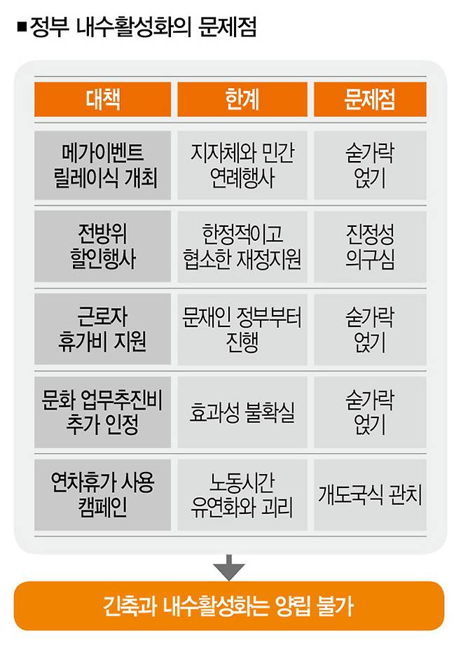 종합하면 정부가 내놓은 내수활성화 대책엔 숙고한 흔적이 보이지 않을 뿐만 아니라, 그 대책이 실질적인 내수부양에 도움이 되는지도 불명확하다. 상당수 대책이 지자체나 민간에서 추진하던 사업들로 채워져 있는 것도 문제다. 더구나 '전 정권의 일'이라면 염증을 내온 것과 달리 문재인 정부에서 추진하던 사업을 '자신들의 플랜'에 넣은 대책도 있다.