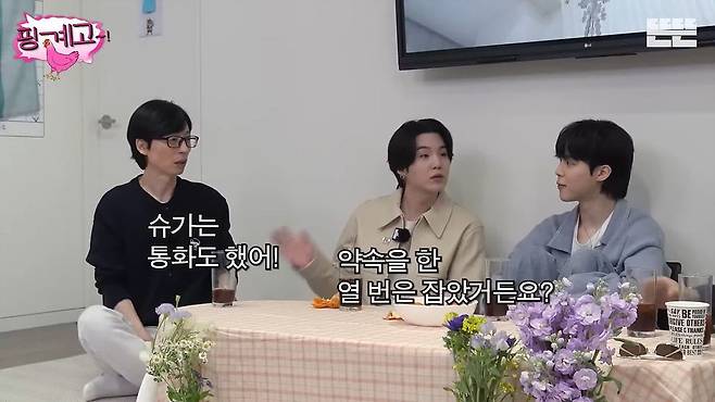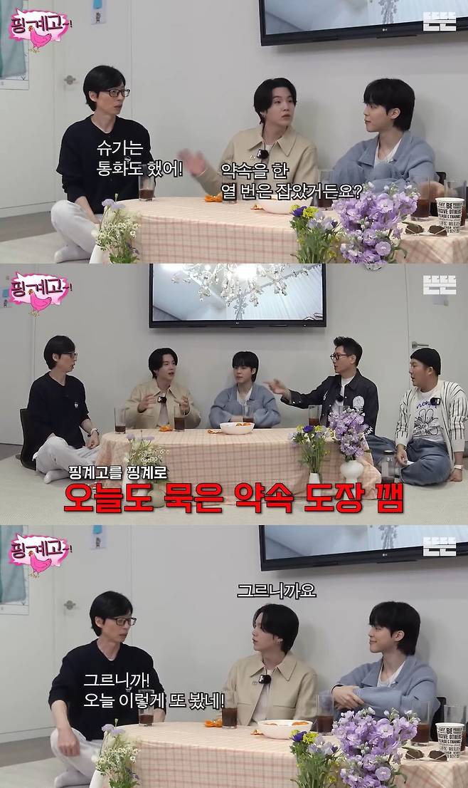 그러자 슈가는 "(유재석과는) 약속을 한 열 번은 더 잡았다. 중간에 있는 형이 있어서. 근데 한 번도 못 뵀다"고 두 사람의 엇갈린 인연을 고백했다.