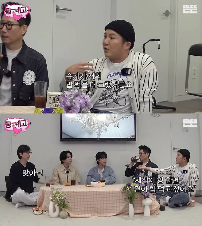 이어 조세호는 "슈가가 저희 밥 먹을 때 그랬다. '재석이 형 한번 같이 밥 먹고 싶다'고"라며 슈가가 유재석을 만나고 싶어했다고 전했다. 유재석은 "맞다. 슈가는 통화도 했다"며 슈가와의 인연을 설명했다.