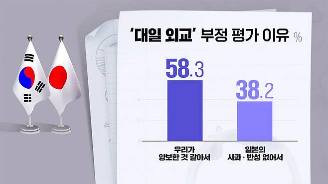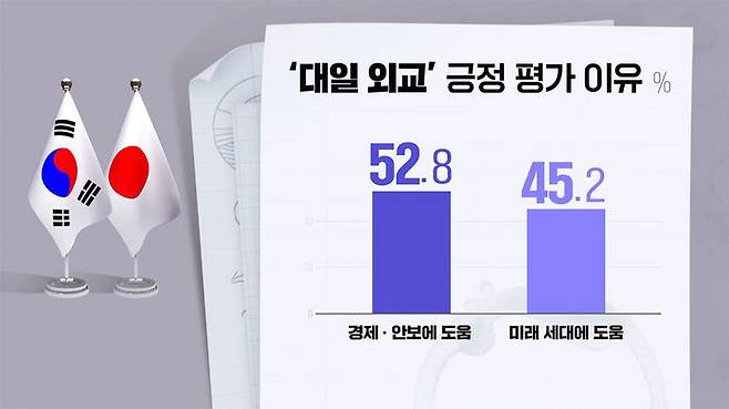 왜 긍정적으로 평가했느냐는 질문에는 양국 협력 강화로 '경제와 안보에 도움이 된다'는 답이 52.8%, 한일 관계 개선이 '미래세대에 도움이 된다' 45.2%를 나타냈습니다.