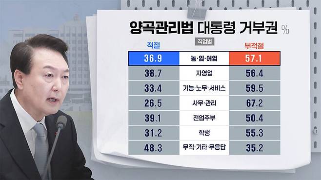 대통령이 본회의를 통과한 양곡관리법 개정안에 거부권을 행사한 데 대해서는 '적절하다'는 답변이 34.7%를 나타냈고, '적절하지 않다'는 답변이 57.1%로 절반을 넘었습니다.