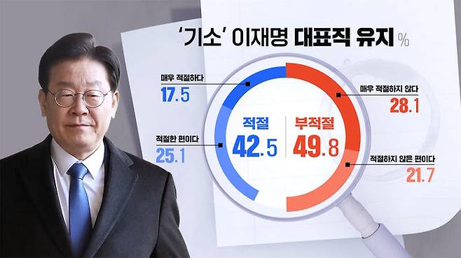 대장동 사건 등으로 기소된 이재명 대표에 대해, 민주당이 정치 탄압을 인정해 당 대표직을 유지하기로 결정한 것은 '매우 적절하다'가 17.5, '적절한 편이다'가 25.1로 긍정 답변이 42.5%였고, '적절하지 않은 편이다' 21.7, '매우 적절하지 않다'가 28.1로 부정 답변이 49.8%였습니다.