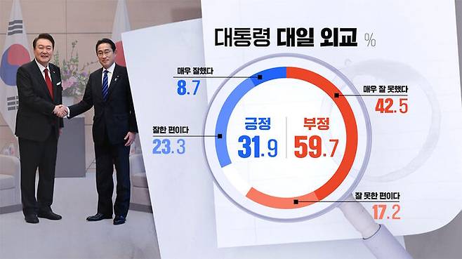먼저 최근 윤석열 대통령이 일본과 정상회담하고, 또 과거사 문제 해결책을 내놓은 데 대해서 어떻게 생각하는지 물었더니 59.7%가 부정적으로 답했습니다.