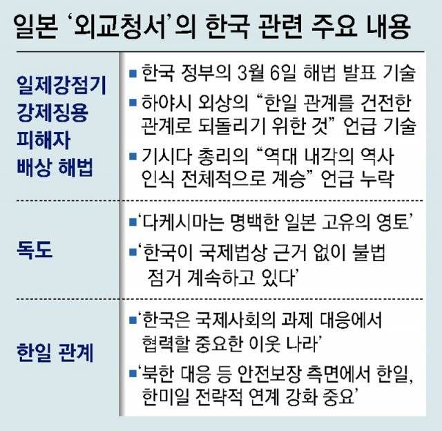 일본은 이번 청서에서 한국의 징용 해법에 관해 하야시 외상이 “2018년 대법원 판결에 의해 매우 엄중한 상태에 있던 한일 관계를 건전한 관계로 되돌리기 위한 것으로 평가하고, 한일 교류가 확대돼 나갈 것을 기대한다”고 언급한 부분을 담았다.