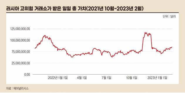 금융 제재 회피 가능성 또한 가상 자산의 어두운 이면이다. 최근 러시아 정부나 정치인이 엄격한 제재를 피하기 위해 가상 자산을 사용하는 것 아니냐는 추측이 제기됐었다. 체이널리시스의 조사에 따르면 가상 자산 시장의 낮은 유동성으로 인해 러시아의 대규모 제재 회피를 지원할 가능성은 낮지만 소규모 활동은 여전히 존재할 수 있는 것으로 나타났다. 러시아 사용자를 대상으로 고위험 거래소 유입을 조사한 결과 2022년 2월 러시아 침공 이후 활동이 소폭 증가했지만 대부분의 급등은 전쟁보다 가상 자산 시장의 전반적인 추세와 더욱 관련이 있는 것으로 밝혀졌다.