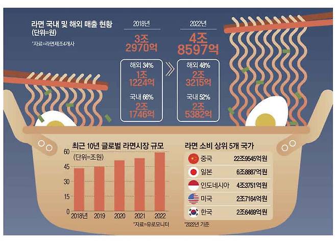 글로벌 시장조사전문기관 유로모니터에 따르면 작년 기준 국가별 연간 라면 소비 규모는 중국(22조9545억원), 일본(6조8887억원), 인도네시아(4조3751억원), 미국(2조7164억원), 한국(2조6469억원) 순이다. 전 세계에서 라면 소비가 4번째로 많은 미국은 자국 내 라면 제조업체가 없어 주요 라면기업들의 경쟁이 가장 치열한 시장으로 꼽힌다.