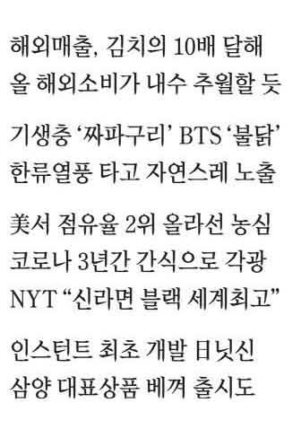 K라면이 해외시장에서의 선전으로 제2의 전성기를 맞은 데는 K컬처 영향이 큰 것으로 지적된다. 2020년 전 세계적으로 화제를 모은 영화 '기생충'에 '짜파구리'가 등장하면서 짜파게티와 너구리가 각광받았다. 그룹 BTS의 멤버 지민, 뷔, 정국 등이 잇달아 불닭볶음면을 먹는 모습을 유튜브에 올린 것도 중국·동남아를 넘어 미국·유럽·남미 등 전 세계로 K라면이 영역을 확장하는 데 큰 도움이 됐다는 평가다.