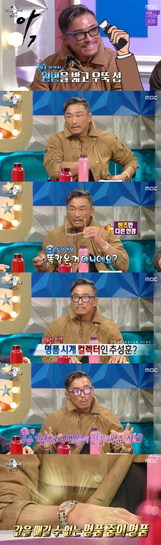 그러자 추성훈은 "원래 이런 걸 좋아했고 이건 제가 3년 전 이긴 시합에서 친구들, 후배들이 50명이 돈을 모아서 사준 것"이라며 명품 중에 명품인 사실을 자랑해 감탄을 자아냈다. (사진=MBC '라디오스타' 캡처)