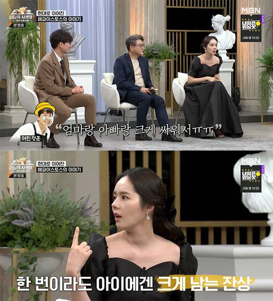 그런가 하면, 한가인은 '헤파이스토스 콤플렉스'에 대한 경험을 밝혔다. 그는 "시부모님이 절대 아이들 앞에서 싸우는 모습을 안 보여주셨는데, 딱 한번 싸우셨다"면서 "그런데 남편(연정훈)이 '엄마랑 아빠랑 크게 싸워서 너무 충격을 받았다'고 하더라. 딱 한 번인데 받는 아이한테는 크게 기억되나보다. 저도 아이 키우는 입장에서 조심해야겠다고 생각했다"고 이야기해 눈길을 끌었다.