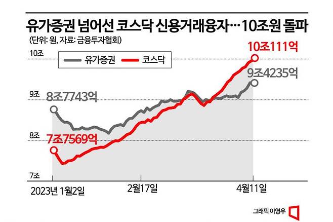 코스닥 시장에서 '빚투(빚 내서 투자)' 규모가 10조원을 돌파했다. 지난해 6월 이후 약 10개월 만에 최고치다.