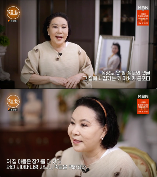 이어 '국민 시어머니'로 불리는 곽정희는 "제가 하도 괴롭혀서 첫재 며느리는 암으로 죽고요, 둘째 며느리 역시 암으로 거의 죽기 직전까지 간 그런 상황. 얼마나 괴로웠으면 며느리들이 같이 살기만 하면 암에 걸려요. 상상도 못할 정도의 댓글(이 달렸다)"라고 밝혔다.