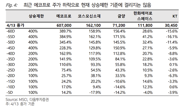 에코프로의 경우 주가가 심사기준일 당일까지 현재 수준 이상으로 반등하면 단기 급등 편입 제외 규정에 의해 편입에 실패할 확률이 높습니다. 공교롭게도 과열 경고음이 커진 뒤 증권사 매도 리포트까지 나오면서 에코르로 주가는 현재 조정 국면에 접어들었습니다. MSCI 편입을 위해서는 지금의 조정 국면이 지속되어야 하는 상황인데요.