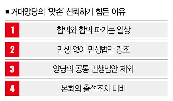 국민의힘만 그랬던 건 아니다. 지난해 12월 예산안 처리와 이태원 참사 국정조사를 두고 맞서던 양당은 '선 예산안 처리 후 국정조사'로 뜻을 모았지만, 예산안 합의가 제대로 되지 않은 상황에서 더불어민주당이 국정조사를 시작해 합의가 깨졌다.