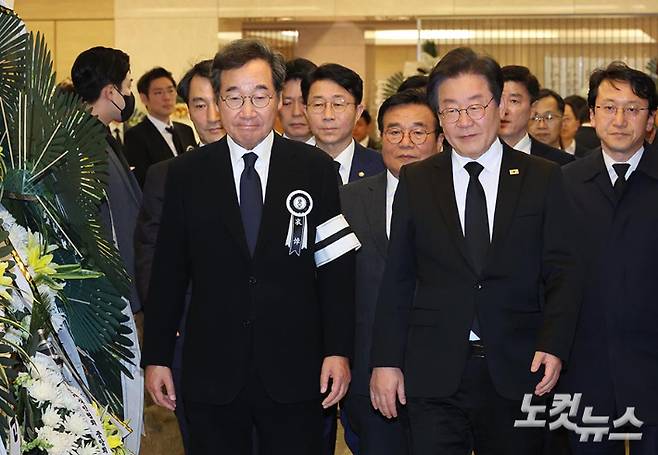 이낙연 더불어민주당 전 대표(왼쪽)가 9일 오후 빈소가 마련된 서울 강남구 삼성서울병원 장례식장을 찾아 조문을 마친 이재명 더불어민주당 대표를 배웅하고 있다. 지난 대선 경선 때 맞붙었던 두 사람이 만난 것은 지난해 3월 이후 13개월 만이다. 윤창원 기자