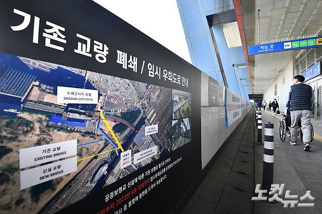 10일 오후 서울 용산역과 서울드래곤시티호텔을 잇는 공중보행교가 철거되는 가운데 임시통행 안내문이 붙어 있다. 용산구에 따르면 용산역사에서 용산전자상가로의 접근성 강화를 위해 1993년 설치된 공중보행교는 철거되며 신설 공중보행교 개통 예정일은 6월 중순이다. 류영주 기자