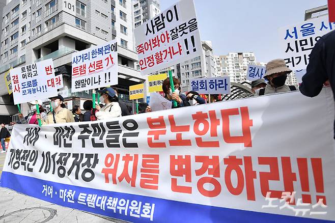 13일 오전 성남 수정구 위례중앙광장에서 위례 트램 착공식이 열린 가운데 반대하는 주민들이 구호를 외치고 있다. 위례신도시의 핵심 교통수단인 '위례선 트램(노면전차)'은 15년만에 첫 삽을 떴다. 지난 2008년 2기 신도시인 위례신도시의 광역교통대책으로 트램 신설이 확정된 후 무려 15년만이다. 류영주 기자