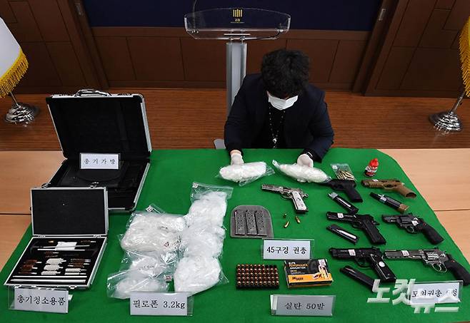 10일 오전 서울 서초구 중앙지검 브리핑실에서 '마약 및 총기류 동시밀수, 국내 최초 적발' 관련 언론 브리핑이 진행되고 있다. 서울중앙지검 마약범죄특별수사팀(부장검사 신준호)은 10일 마약판매상 장모(49)씨를 특정범죄가중처벌법상 향정 및 총포·도검·화약류 등 안전관리법 위반 혐의로 구속기소했다고 밝혔다. 검찰에 따르면 장씨는 지난해 7월 미국 LA의 주거지에서 마약과 권총, 실탄을 이삿짐으로 위장해 선박화물로 발송해 9월 부산항에 도착하게 하는 방법으로 국내에 들여왔다. 황진환 기자