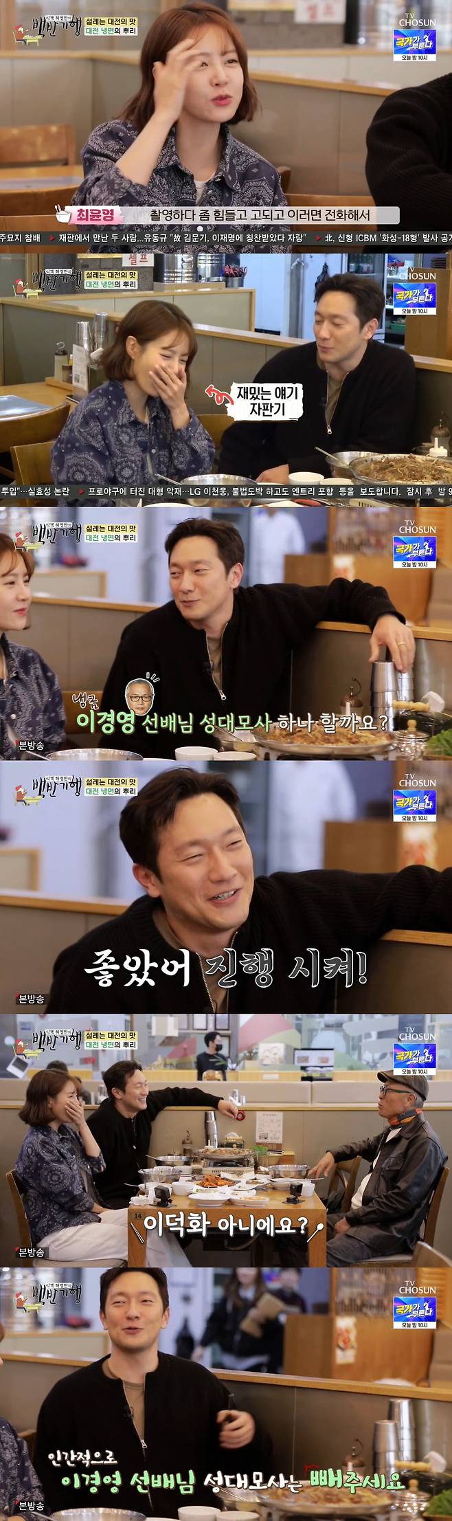 손석구는 '최윤영과 자주 만나느냐'는 질문에 "서로 촬영하니까 바빠서 자주 못 만난다"고 했다. 최윤영은 "촬영하다가 좀 힘들고 고되고 이러면 전화해서 '재미있는 얘기 없냐'고 하신다"고 했고, 손석구는 "자판기처럼 '재밌는 얘기'하면 바로 나온다"고 했다. 그러자 최윤영은 "방송 출연 결정되고 오빠가 '가서 뭐하지?'라면서 성대모사를 연습하고 있다더라"고 했다. 이에 손석구는 바로 이경영 성대모사를 선보였지만, 제작진은 "이덕화 아니냐"고 했다. 결국 손석구는 "성대모사는 빼달라"고 해 웃음을 안겼다.
