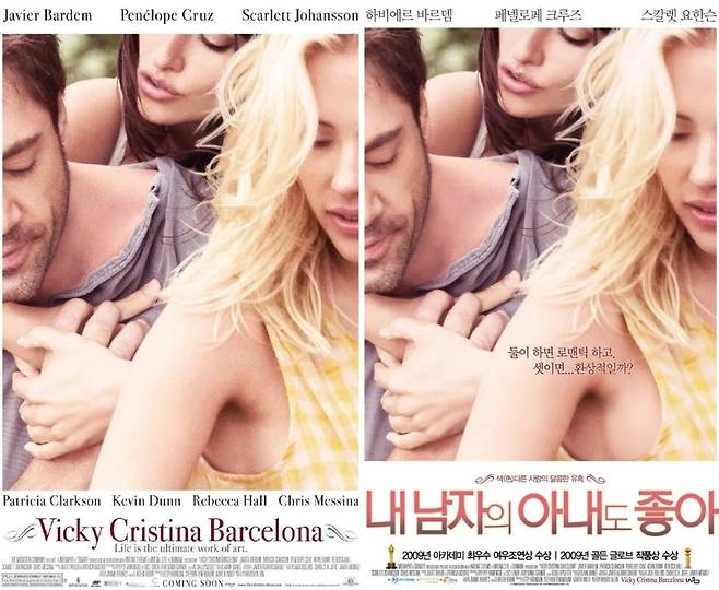 2009년 개봉했던 우디 앨런 감독의 '내 남자의 아내도 좋아'의 국내 포스터에서는 스칼렛 요한슨의 가슴 부분을 포토샵으로 부각한 것이 발견되면서 비판을 받았다.