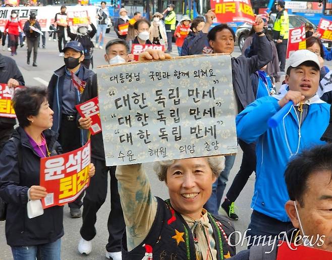 이날 촛불대행진에 참석한 수만 명(주최 쪽 추산 2만, 연인원 3만)의 시민들은 몸엔 흰색 천으로 만든 '자주독립' 망토를 걸치고, 손엔 "주권 침해, 미국 사죄!", "주권 포기, 윤석열 퇴진!"이란 글자가 적힌 손 팻말을 들었다.