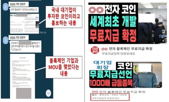 불법 금융을 고발하는 한 커뮤니티 게시판 분류 대부분은 가상자산이 차지하고 있다. 피해 사례도 천차만별이다. 특히 유투브나 SNS를 통한 허위 광고 사례가 늘고 있다. 국내 삼성전자 총수가 투자한 코인이라며 1,000%의 수익률을 보장한다는 내용으로 홍보를 하는 영상은 수십만회 이상 조회 수를 기록했다. 이들은 불법으로 자금을 모집한 후 채널을 폐쇄하는 방식으로 광고를 이어가고 있다.