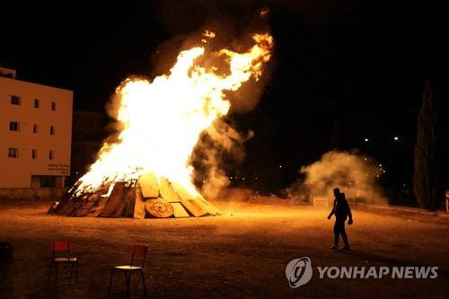 A young Christian Orthodox walks by a bonfire lit outside the Agia Paraskevi Christian Orthodox church in Lakatamia, a suburb of the capital Nicosia, Cyprus, early Sunday, April 16, 2023. Cypriots lit the traditional Easter bonfires, or lambradjia, as it is known in Cyprus, where they burned effigies of Judas Hiscariot, the disciple thought to have betrayed Jesus. (AP Photo/Petros Karadjias)