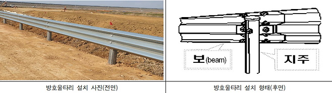 가드레일(방호 울타리)은 사고가 나더라도 차량이 길 밖이나 반대편 차로로 이탈하는 걸 막아줘야 합니다. 그러려면 '지주'가 땅에 단단히 박혀 강성과 수평 지지력을 가져야 하고, 차량과 직접 부딪히는 가로로 긴 형태의 '보' 역시 안전 기준을 충족해야 하죠.
