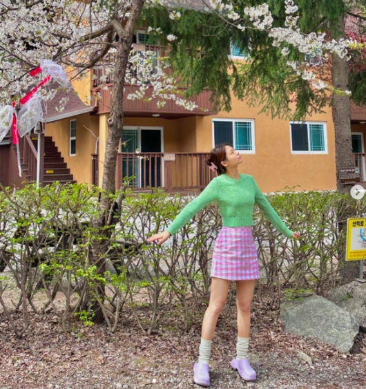설현은 16일 “이번엔 아빠도 함께한 나들이. 엄청 재미있었다”라며 가족들과 함께한 나들이 사진을 공개했다. 사진 속 설현은 초록색 니트에 체크무의 핑크색 미니스커트를 입고 뉴트로 감성의 스타일을 완성했다. 또한 그는 집게핀으로 머리를 묶어 올리며 활짝 핀 벚꽃을 바라보는 모습이 담겨있다.