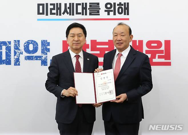 [서울=뉴시스] 전진환 기자 = 김기현 국민의힘 대표가 17일 오전 서울 여의도 국회에서 송주범 지방자치위원회 위원장에게 임명장을 수여 후 기념촬영을 하고 있다. 2023.04.17. amin2@newsis.com