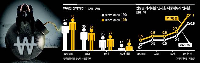 문제는 고금리 속에 돈을 빌리고 제때 갚지 못하는 취약차주가 늘어나면서 가계대출 연체율이 다시 오르고 있다는 점이다. 연체율은 30일 이상 연체 전액 합계를 30일 이상 대출 잔액 합계로 나눈 값을 의미하는데, 지난해 말 기준 가계대출 연체율은 30대 이하 0.5%, 40·50대 0.6%, 60대 이상 0.7%로 전 연령대에서 1년 전보다 0.1%포인트 상승했다.