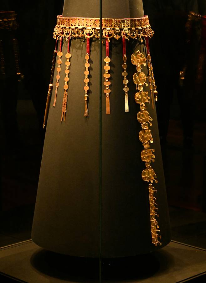 The belts were also a symbol of royal authority. A leather band covered with gold square plates, the belt was adorned with heart-shaped spangles and gold pendants that resemble various objects.