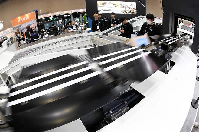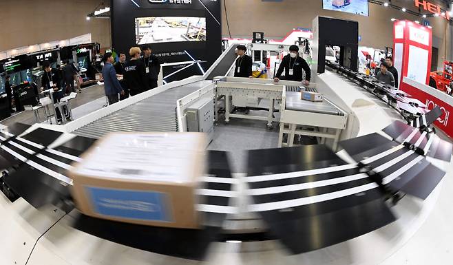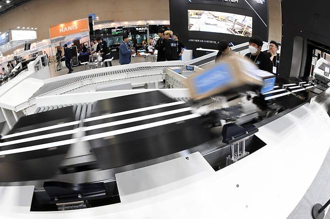 국내 최대 규모의 물류산업 박람회 '제13회 국제물류산업대전(KOREA MAT 2023)'이 18일 경기 고양시 킨텍스에서 열렸다. 태성시스템 부스에서 관계자가 화물을 좌우로 디버팅, 스위칭할 수 있는 휠 소터 시스템을 시연하고 있다.