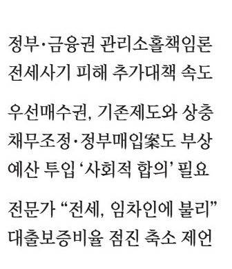 임재만 세종대 부동산학과 교수는 "무분별하게 전세대출을 내준 금융기관과 전세시장을 제대로 관리하지 못한 정부도 손실을 함께 책임질 필요가 있다"고 말했다.