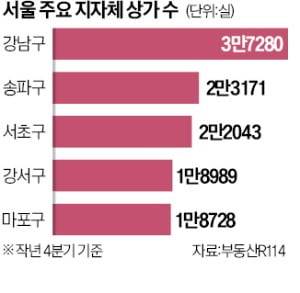 서울에서도 강남 3구, 강서, 마포 등 업무시설이 밀집하고 유동 인구가 많은 지역의 상가가 크게 늘었다. 강남구는 작년 2분기 3만3454실에서 4분기 3만7280실로 증가했다. 서초구(2만69실→2만2043실), 송파구(2만1050실→2만3171실) 등도 증가세가 뚜렷했다.