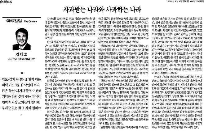 | ▲ <조선일보> 2015년 8월 3일 자 '사과받는 나라와 사과하는 나라' 칼럼 |