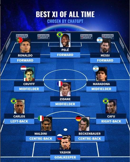 독일 트란스퍼마크트는 18일(한국시간) 인공지능 '챗GPT'가 선정한 역대 베스트 11을 공개했다.