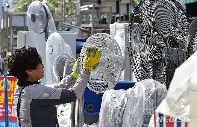 [대구=뉴시스] 이무열 기자 = 초여름 날씨를 보인 19일 대구 북구 칠성시장 중고 가전제품 상점에서 한 상인이 선풍기의 묵은 먼지를 닦아내고 있다. 2023.04.19. lmy@newsis.com