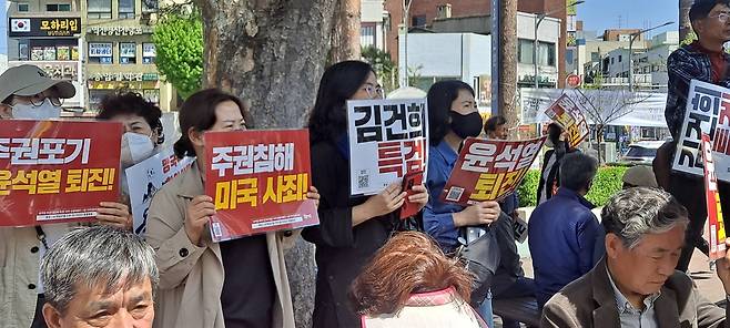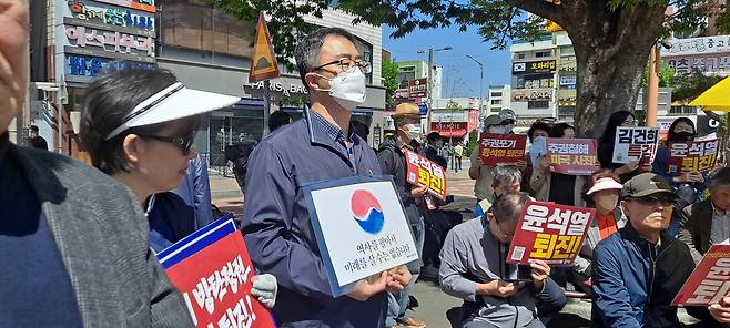 충남 아산시 온양 장날인 19일 오전 온양온천역 앞에 모인 충남도민들은 "윤석열 정권이 등장한 지 1년도 안되어 나라가 결딴나고 민중의 삶이 도탄에 빠졌다"며 "윤석열 정권 퇴진"을 촉구했다.
