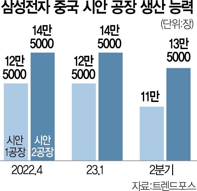 특히 2분기 동안 삼성전자의 유일한 메모리 생산 거점인 시안 반도체 공장에서 감산 폭이 큰 것으로 나타났다. 중국 시안 1공장의 경우 지난해 4분기 생산량인 월 12만 5000장에서 12% 줄인 월 11만 장까지 감산할 것으로 예상된다. 또 시안 2공장은 기존 14만 5000장에서 약 7% 줄인 13만 5000장으로 운용할 것으로 추산된다. 시안 공장은 삼성전자 전체 낸드 생산량 가운데 약 40%를 차지한다. 주로 128단(V6) 낸드플래시를 생산하는 것으로 알려졌다.