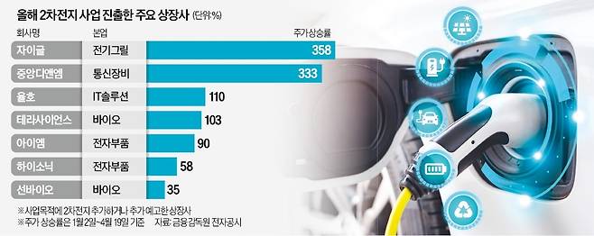 통신장비 업체 중앙디앤엠(상승률 333%), 정보기술(IT) 솔루션 업체 율호(110%), 전자부품 업체 아이엠(90%) 등도 비슷한 이유로 올해 큰 폭의 상승률을 기록했다. 중앙디앤엠은 2차전지 소재 제조 및 판매를, 율호는 폐배터리 재활용 관련 사업을 사업목적에 추가했다.
