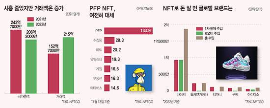 NFT 시장은 사실 2022년에도 성장하기는 했다. NFT 데이터 전문 플랫폼 ‘NFTGo’에 따르면 2021년 152억7000만달러였던 NFT 누적 거래액은 2022년 243억7000만달러로 오히려 증가했다. 지난 5월 미국 ‘금리 인상’과 ‘루나 사태’를 거치며 주춤하기는 했지만 거래액은 꾸준히 늘어나고 있다.