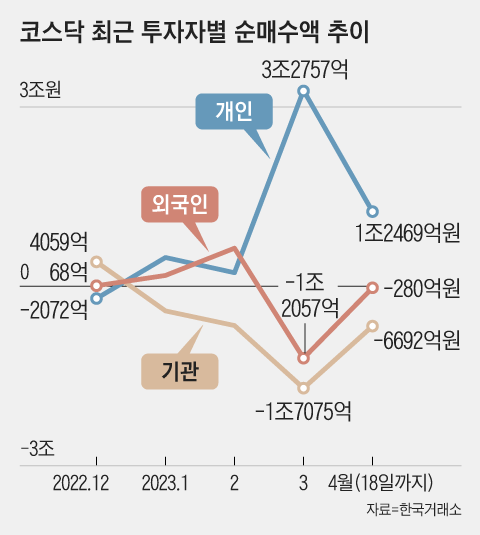 코스닥 시장에선 외국인들이 여전히 매도세를 보이고 있다. 지난달 개인들이 코스닥에서 2차전지 관련주 등을 3조2757 억원어치 매수하며 코스닥 상승세를 주도한 반면 외국인과 기관은 각각 1조2057억원, 1조7075억원어치 순매도했다. 이어 이달도 외국인이 280억원, 기관은 6692억원어치를 순매도했다. 다만 외국인들은 2차전지 관련주와 JYP, YG 등 엔터테인먼트주, 셀트리온 등 바이오주 위주로 매수세를 보이며 순매도 규모는 90% 이상 줄었다.