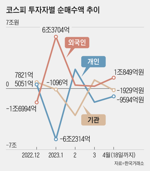 19일 한국거래소에 따르면 이달 외국인 투자자의 코스피 순매수액은 18일까지 1조849억원을 기록했다. 지난해 12월 코스피에서 1조7000억원 가까이 순매도했던 외국인은 올해 1월 6조3704억원을 사들이며 ‘깜짝 랠리’를 이끌었지만 이후 순매수액 규모가 2월 4252억원, 3월 2882억원을 기록하며 급감했다. 그런데 이 달 들어 1조원대로 매수세가 돌아온 것이다.