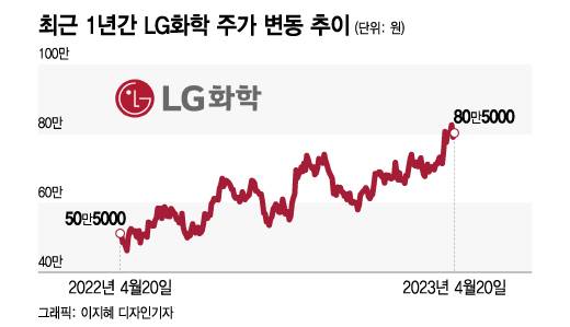 이날 오전 10시32분 기준으로 LG화학은 전일 대비 1만원(1.27%) 상승한 80만원에 거래 중이다. LG화학의 주가는 지난 1년간 꾸준히 우상향해 58.41% 오르면서 같은 기간 코스피 변동률(-5.57%)을 큰 폭으로 상회했다. 특히 올해 2차전지 랠리를 타고 연초 저점 대비 37.69% 올랐다.